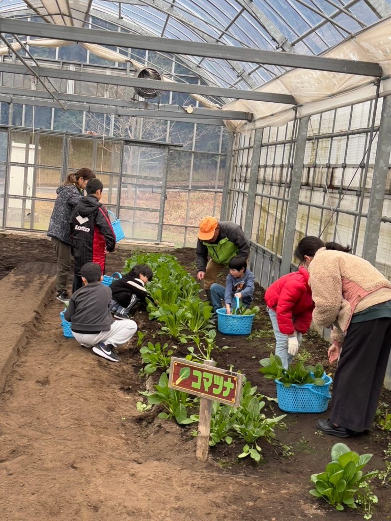 グリーンファームについてからは、小松菜の収穫を行いました。施設の方のお話をしっかりと聞いて、大きなものを選び引き抜き、根っこを切り落とし袋に入れました。「めっちゃ新鮮だね!」「どうやって食べるのが一番おいしいかな?」と、野菜に興味関心を持ち、満足そうな笑顔を見せてくれました。